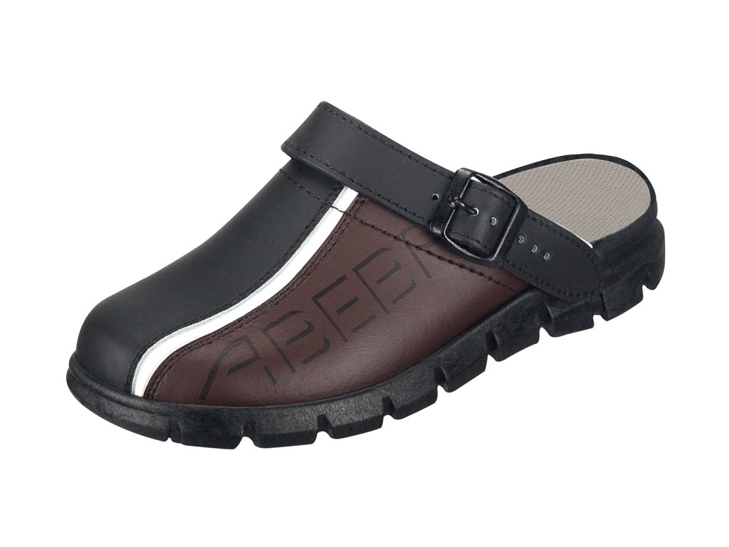 Pantofle s plnou špičkou a vrchní části nártu vyrobenou z hladké kůže. Součástí je pásek, který lze libovolně nastavit pro pohodlné a bezpečné nošení.