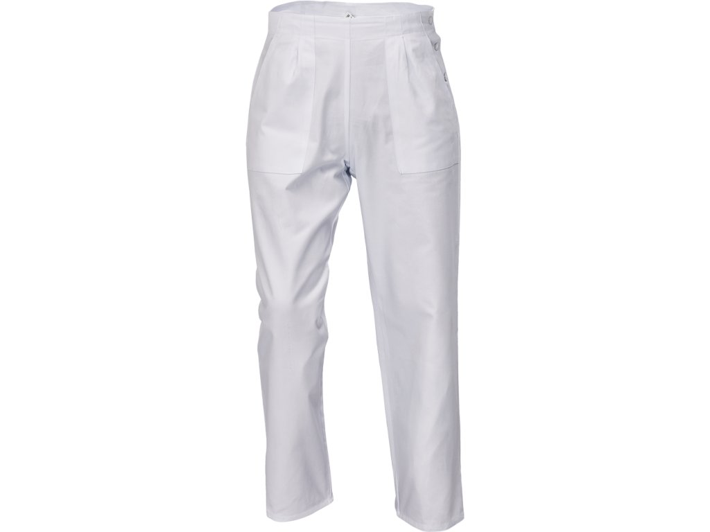 Dámské bílé pracovní kalhoty ušité ze 100% bavlny s bočním zapínáním na knoflíky, dvě přední klínové kapsy.