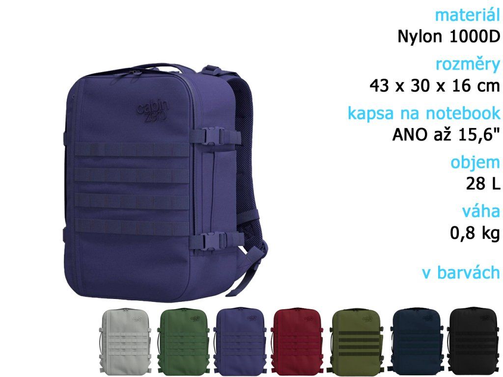 Batoh této velikosti je menším bratrem oblíbeného CabinZero Classic a svou velikostí odpovídá požadavkům většiny nízkonákladových společností na palubní zavazadla.