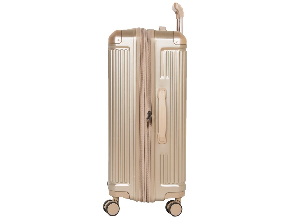Skořepinový kufr na čtyřech kolečkách s metalickým povrchem, integrovaným expandérem a TSA zámkem.