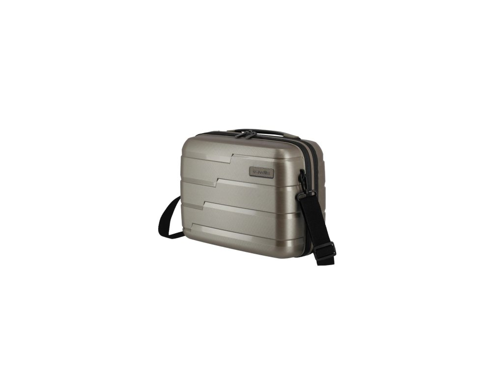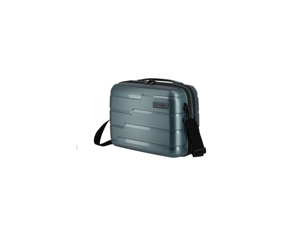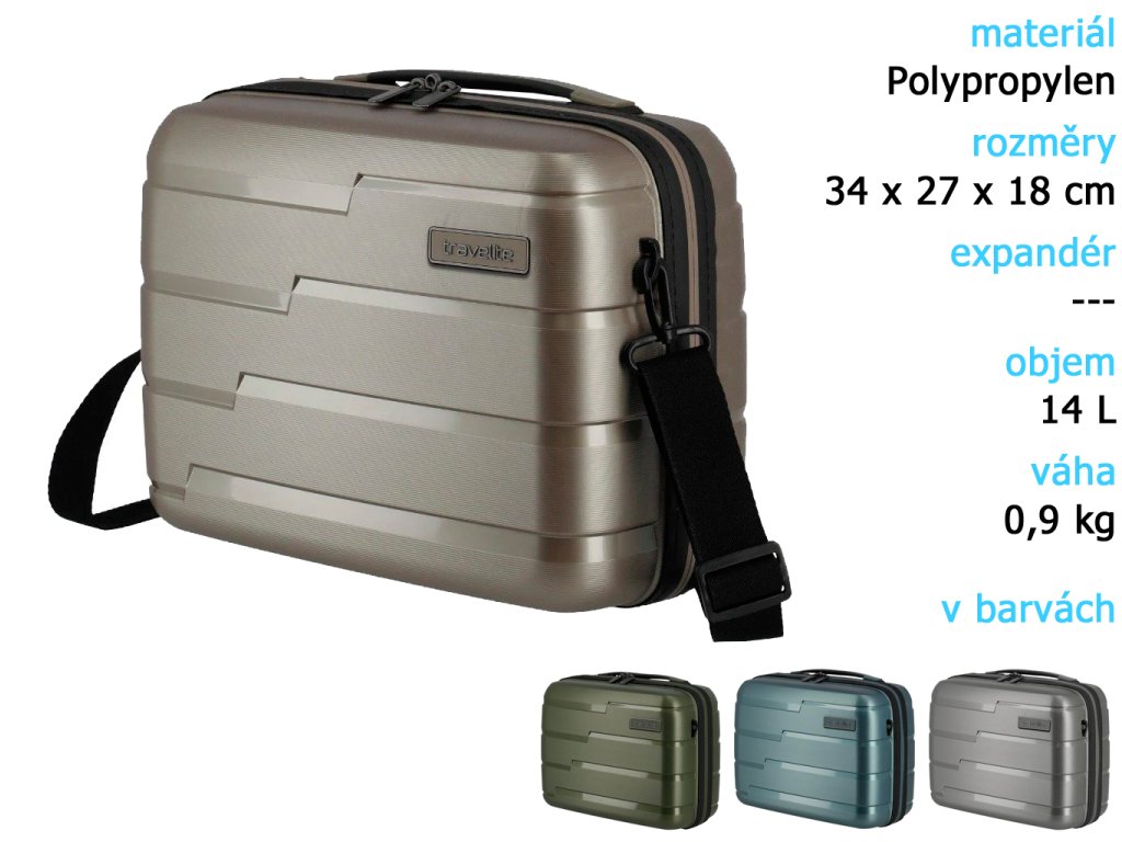 Kosmetický kufřík vyrobený z polypropylenu, s odnímatelným popruhem přes rameno, praktickým vnitřním členěním a průvlekem pro nasazení na madlo kufru.