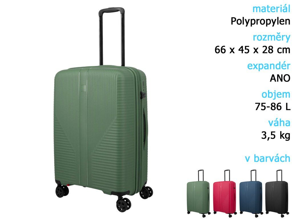 Elegantní a prostorný skořepinový kufr z odolného polypropylenu, vybavený čtyřmi kolečky, TSA zámkem a možností zvětšení objemu díky expandéru až o 15%.