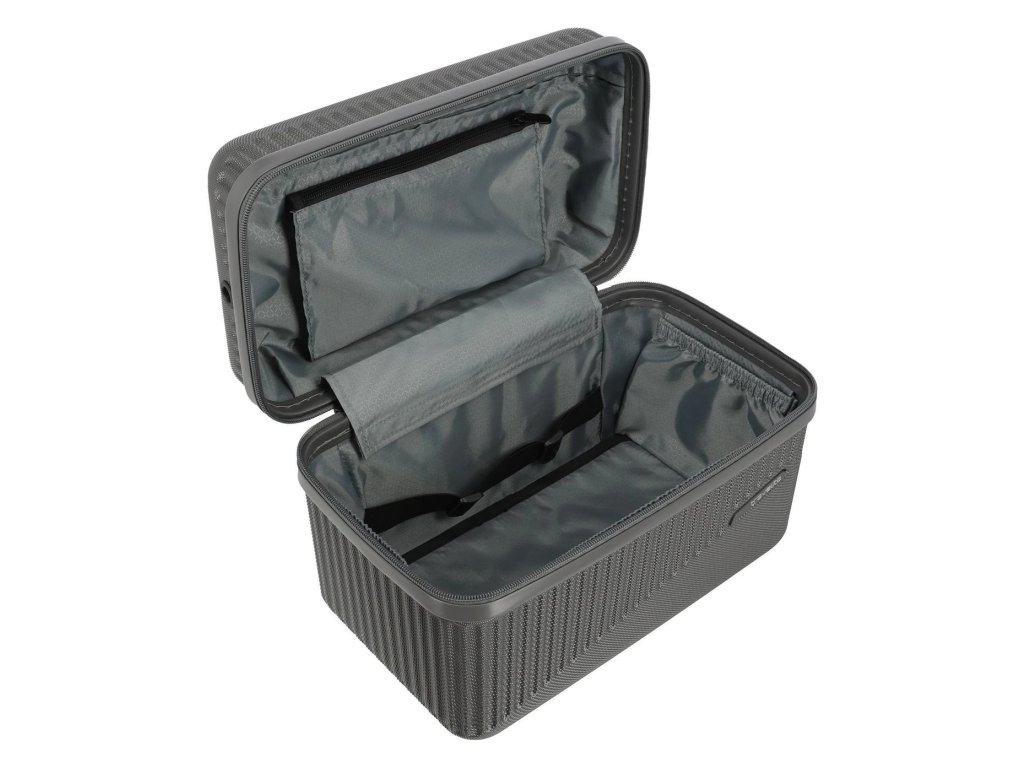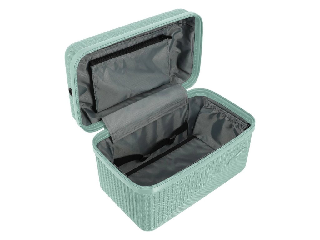 Skořepinový kosmetický kufřík z robustního ABS plastu s hrubou úpravou proti poškrábání vybavený odnímatelným popruhem přes rameno.