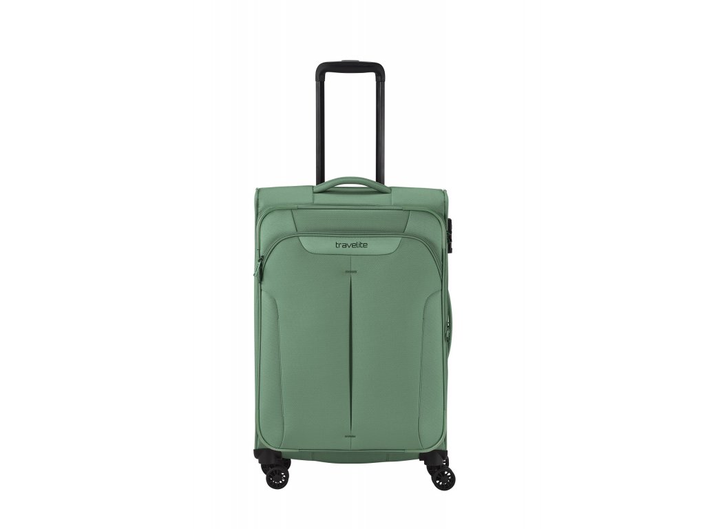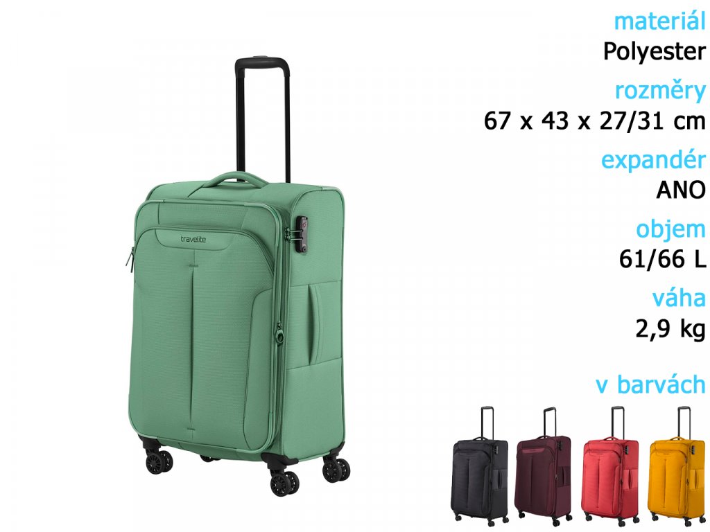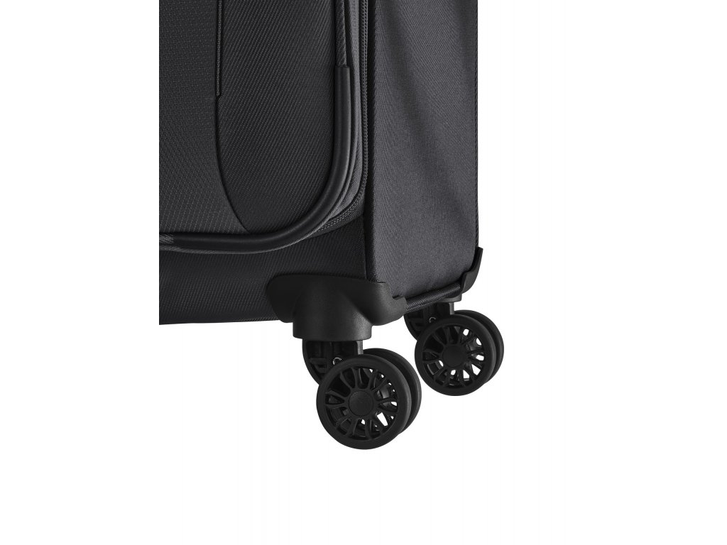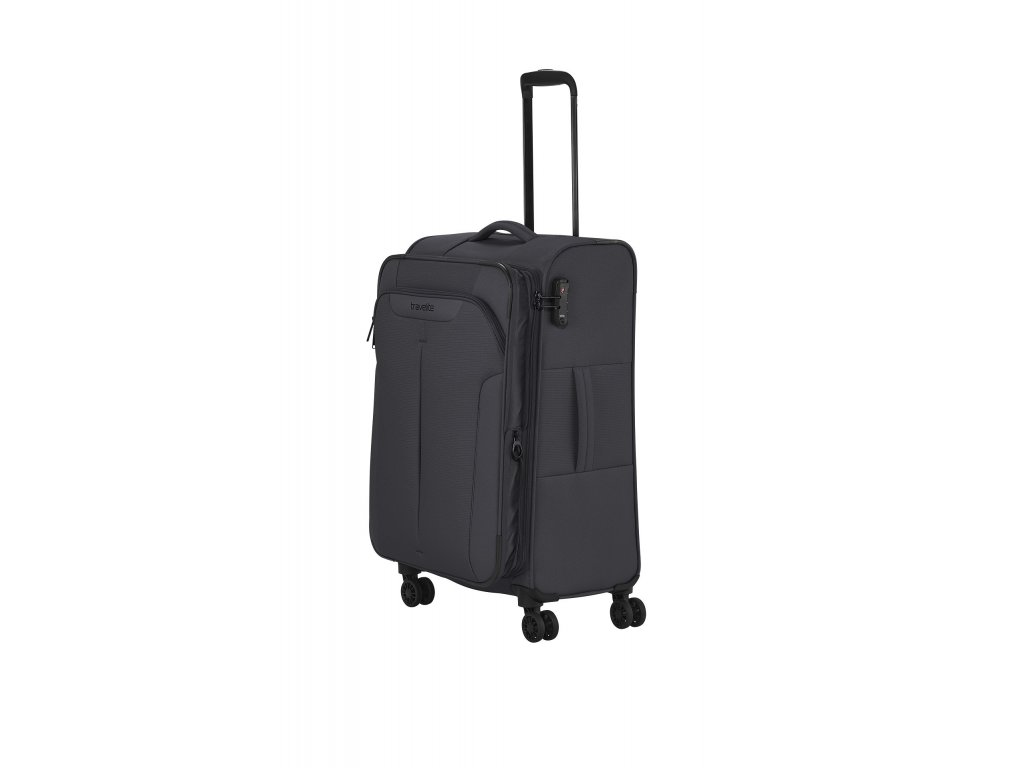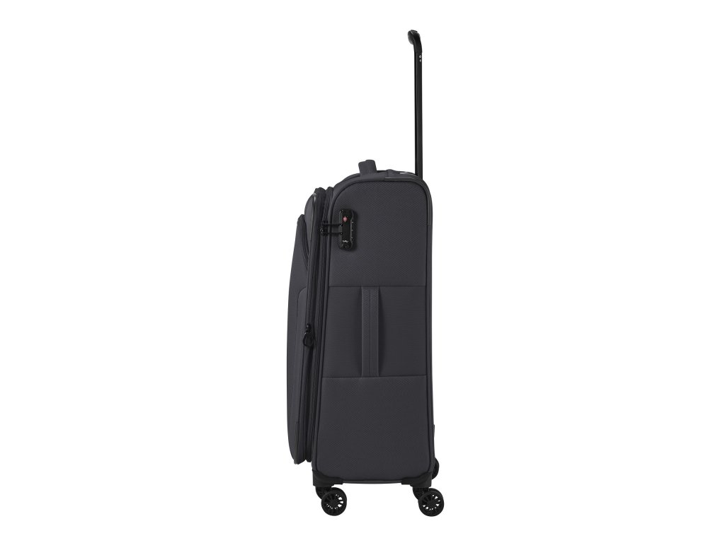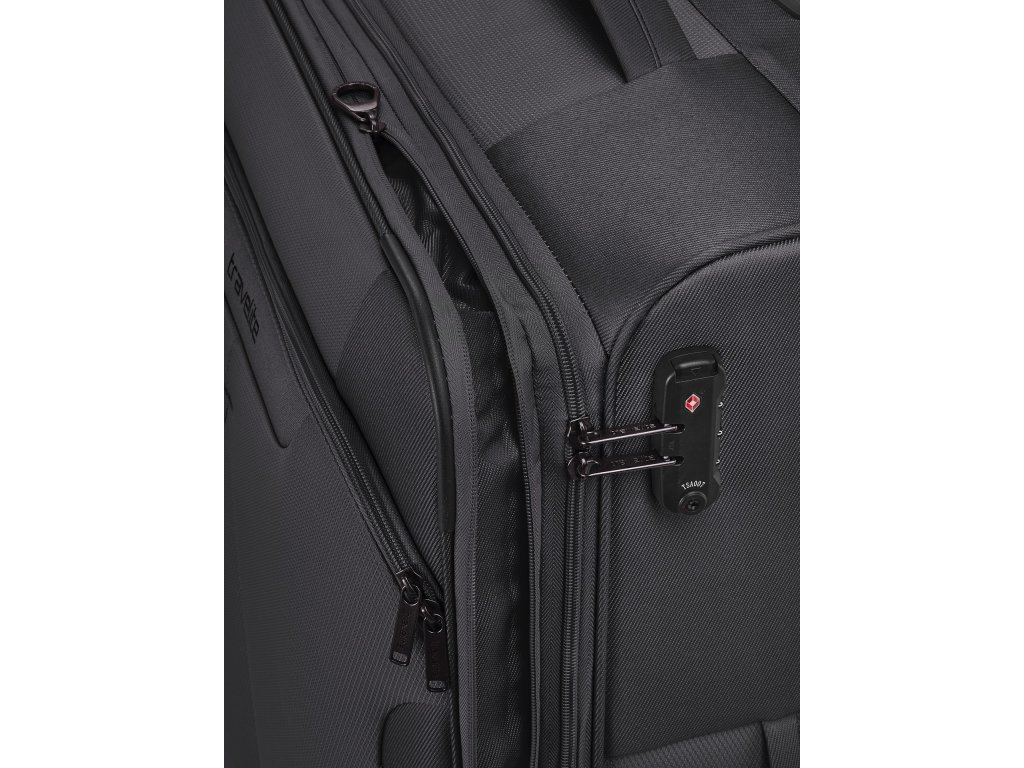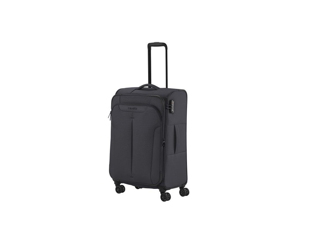 Textilní cestovní kufr na čtyřech kolečkách vybavený integrovaným TSA zámkem, expandérem a přední kapsou na zip.