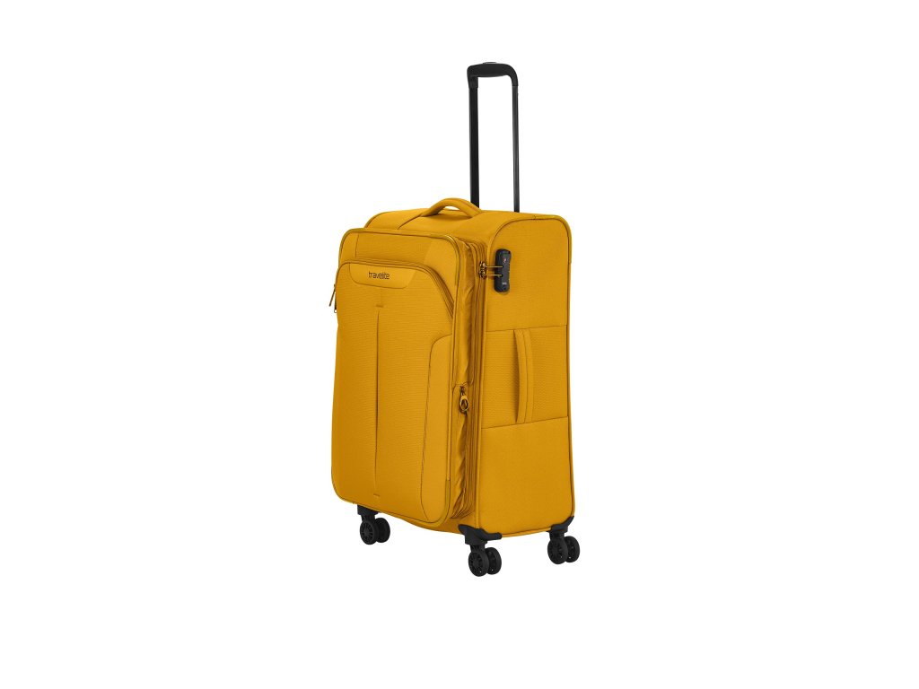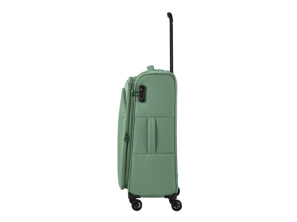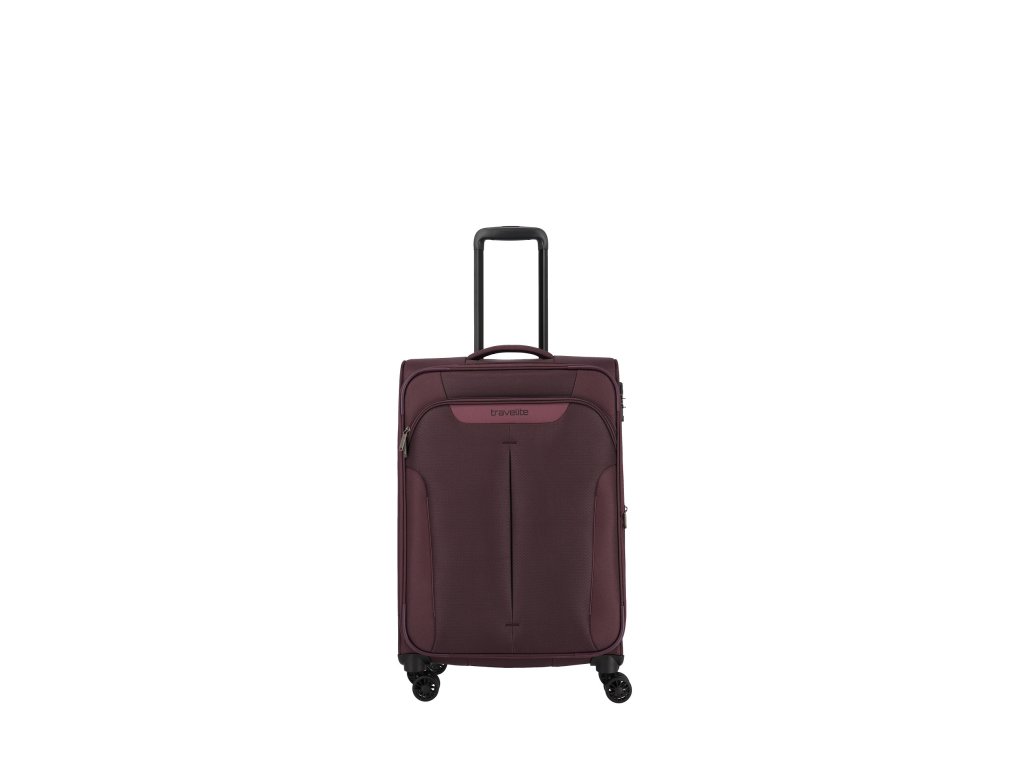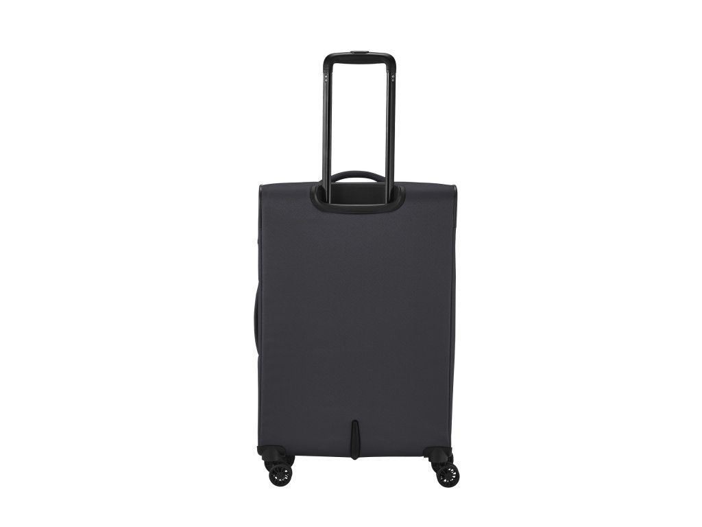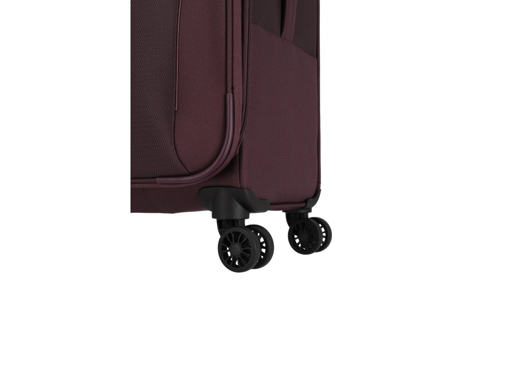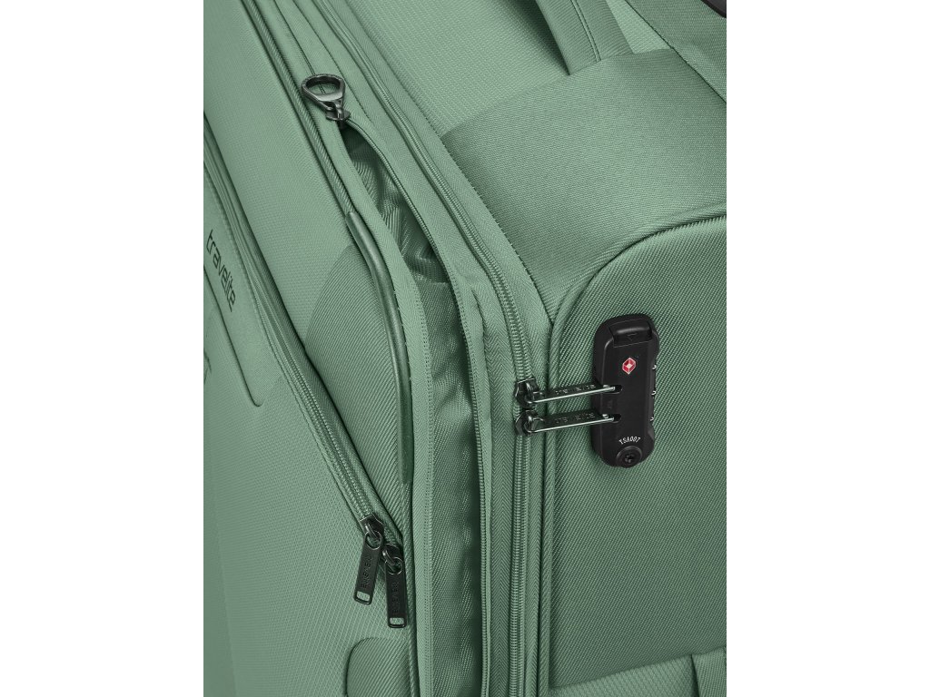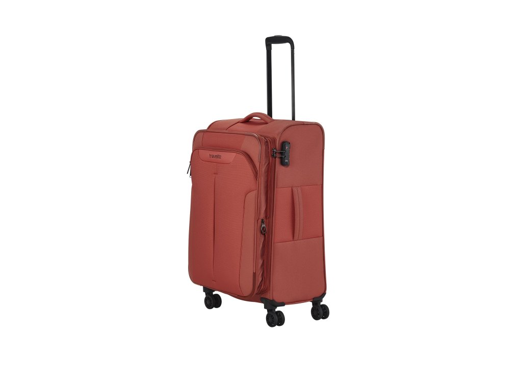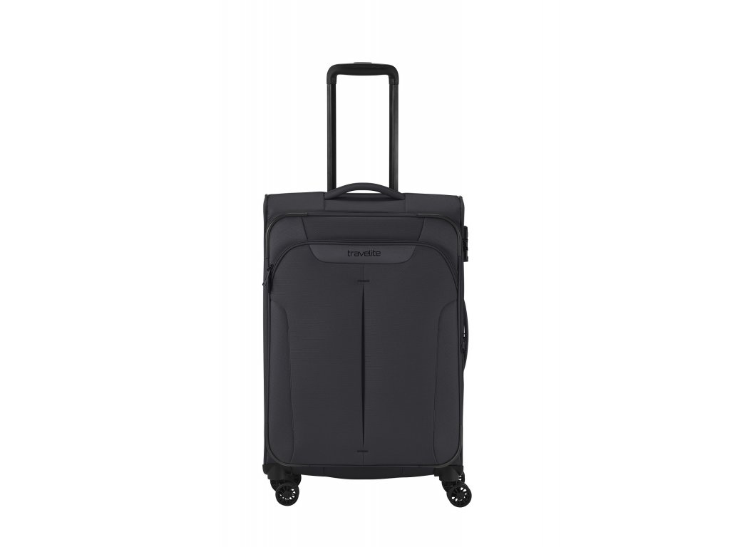 Textilní cestovní kufr na čtyřech kolečkách vybavený integrovaným TSA zámkem, expandérem a přední kapsou na zip.