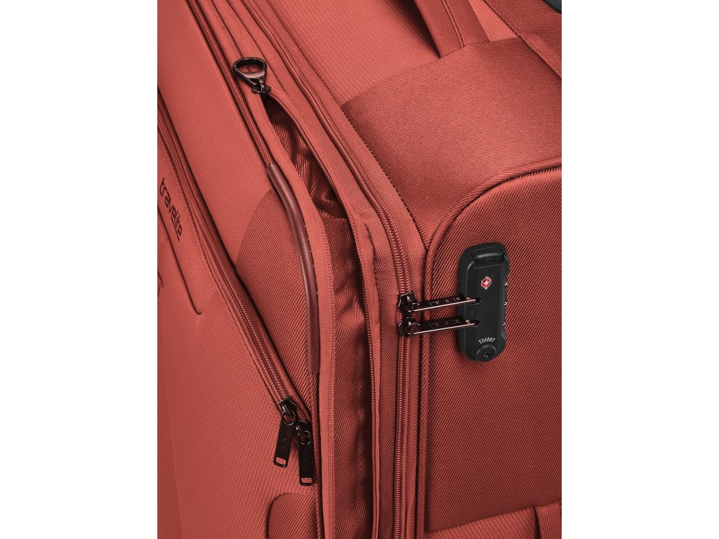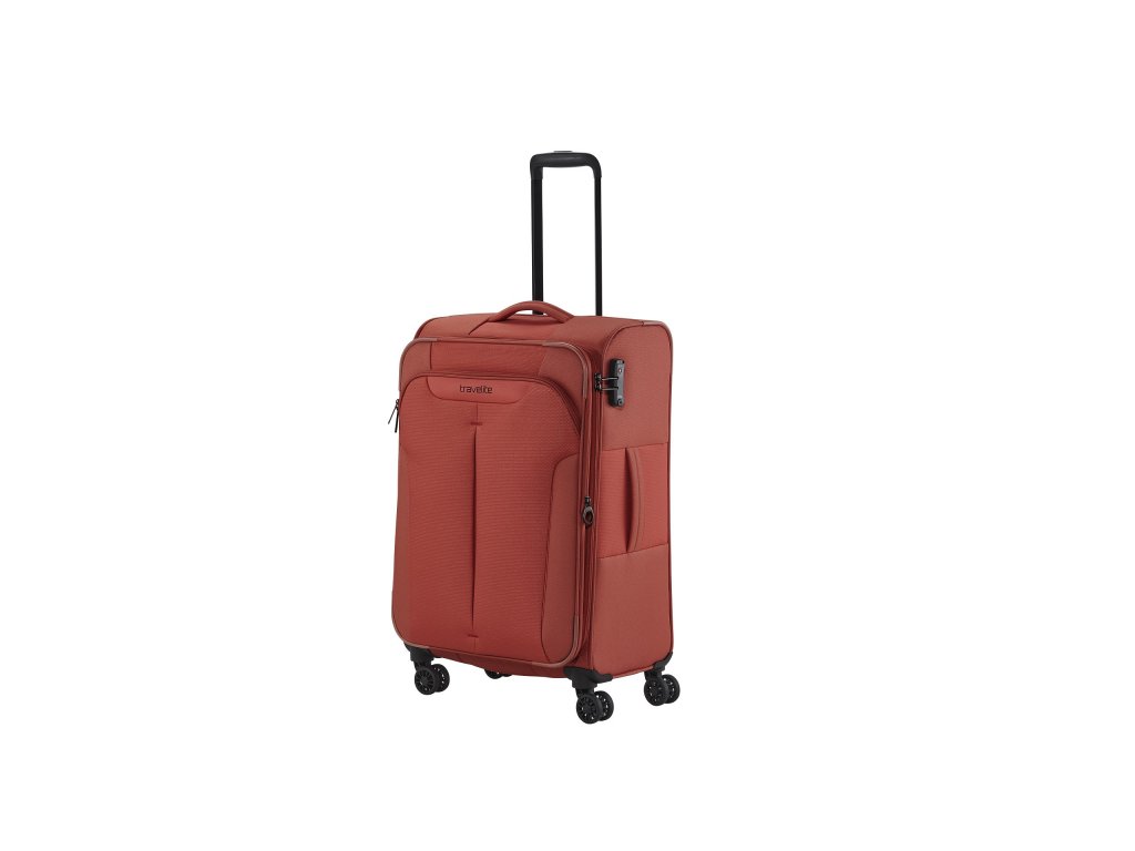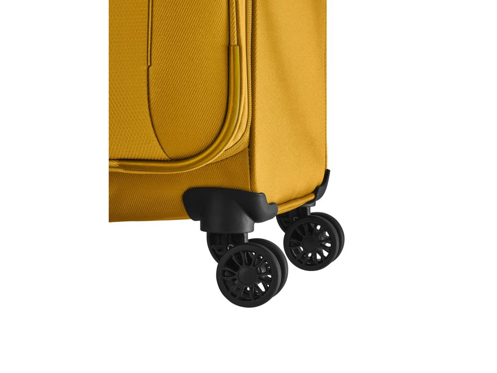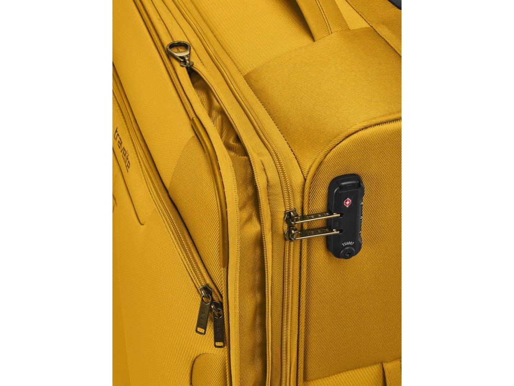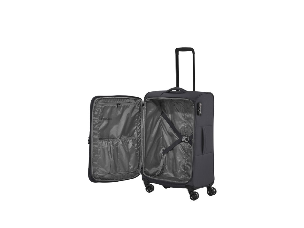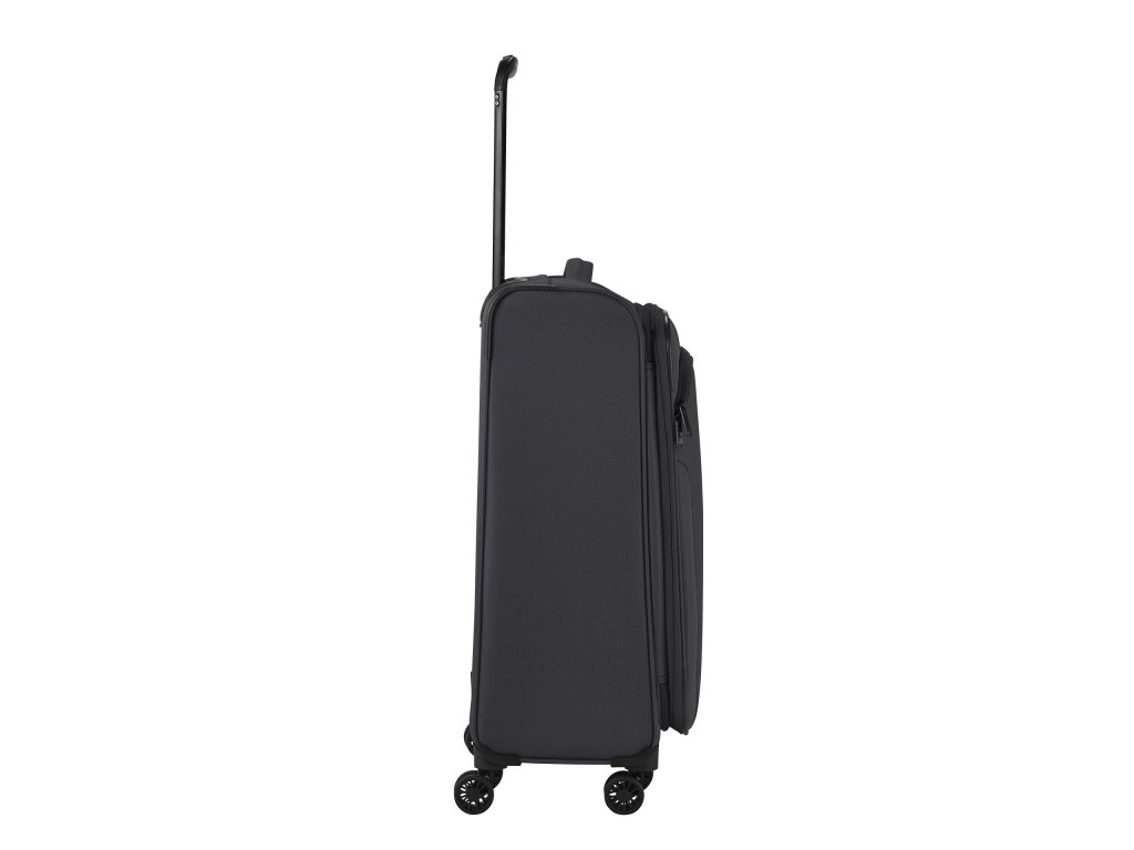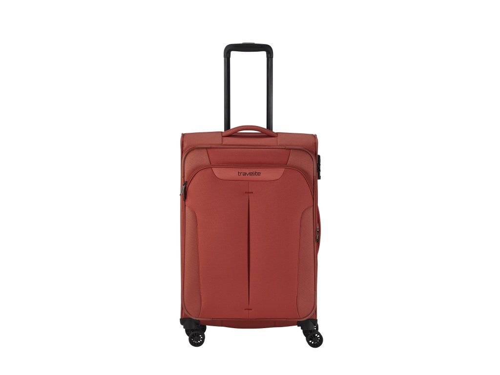 Textilní cestovní kufr na čtyřech kolečkách vybavený integrovaným TSA zámkem, expandérem a přední kapsou na zip.