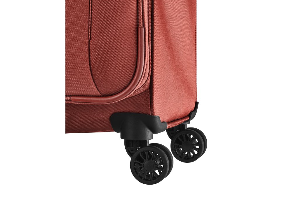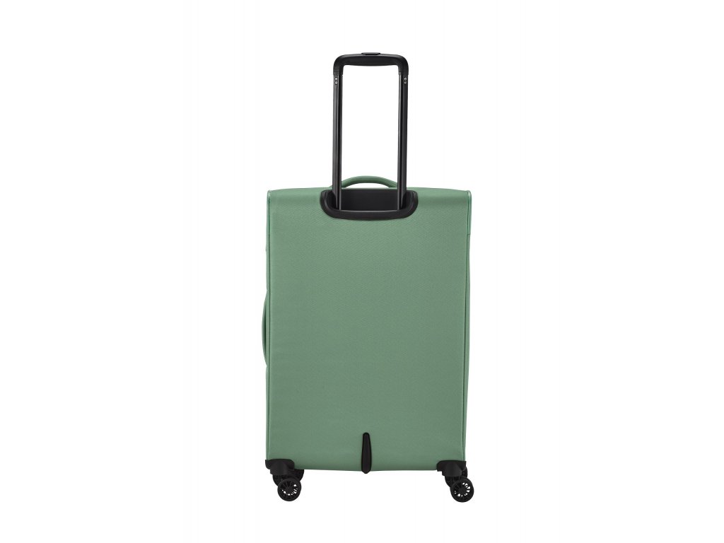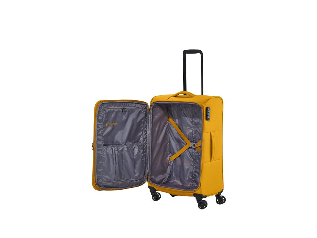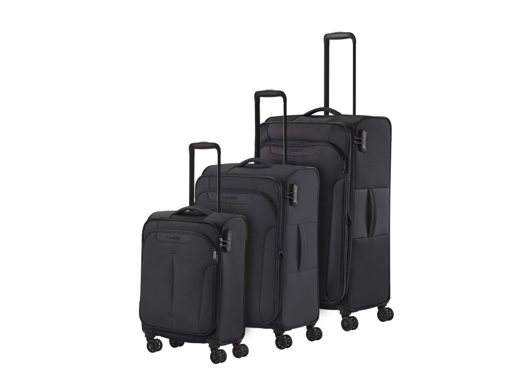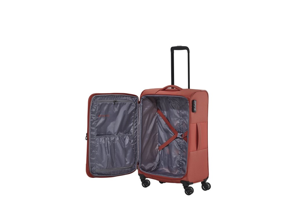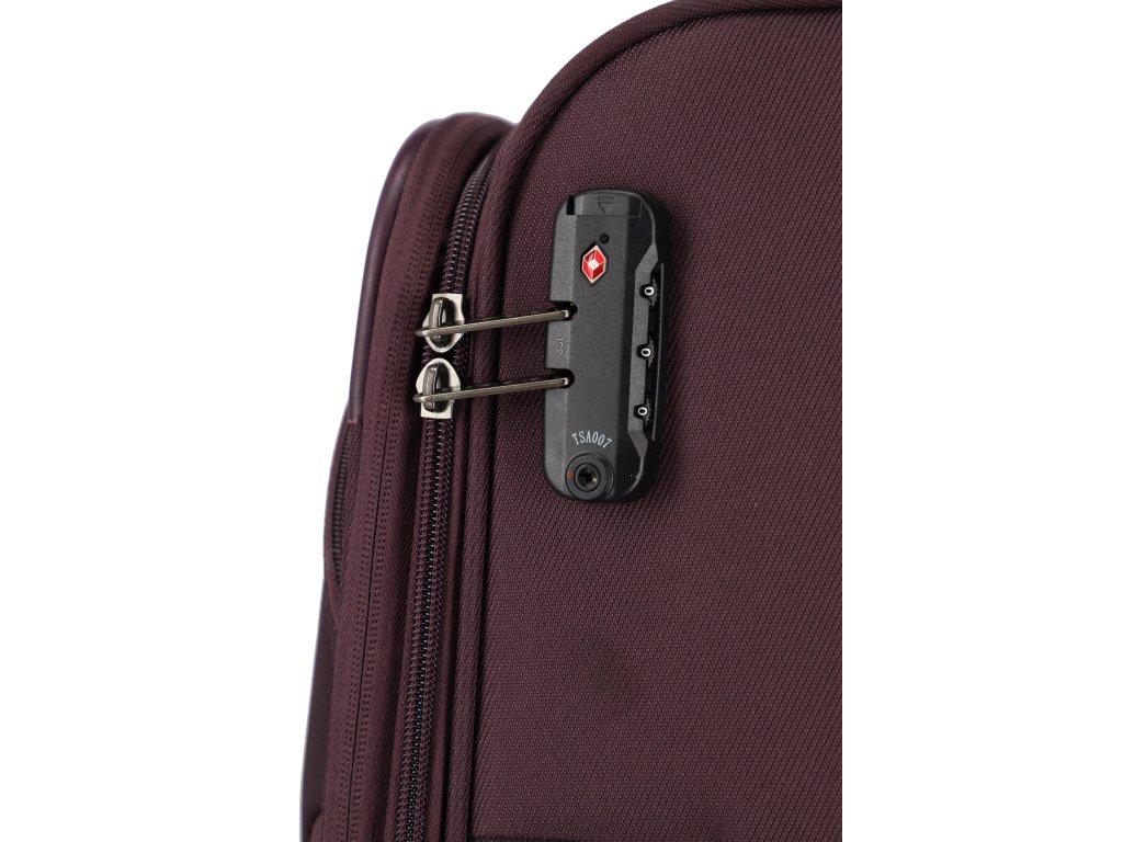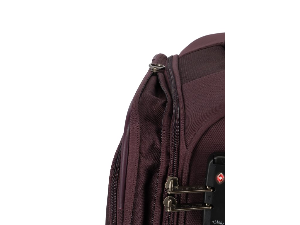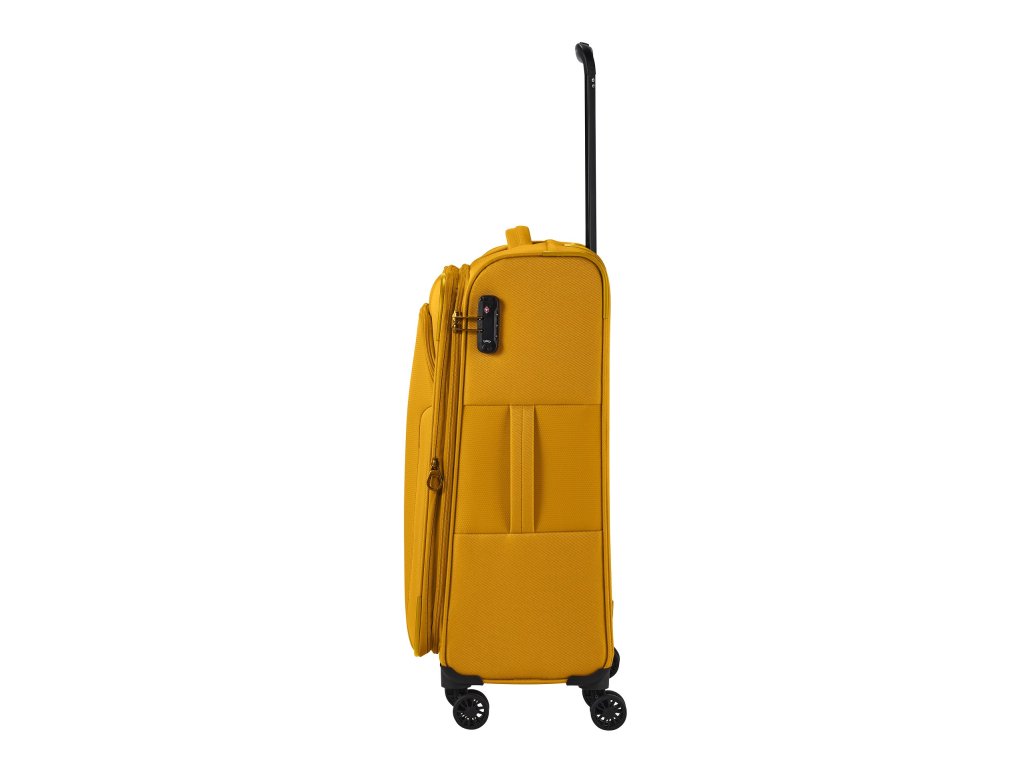 Textilní cestovní kufr na čtyřech kolečkách vybavený integrovaným TSA zámkem, expandérem a přední kapsou na zip.