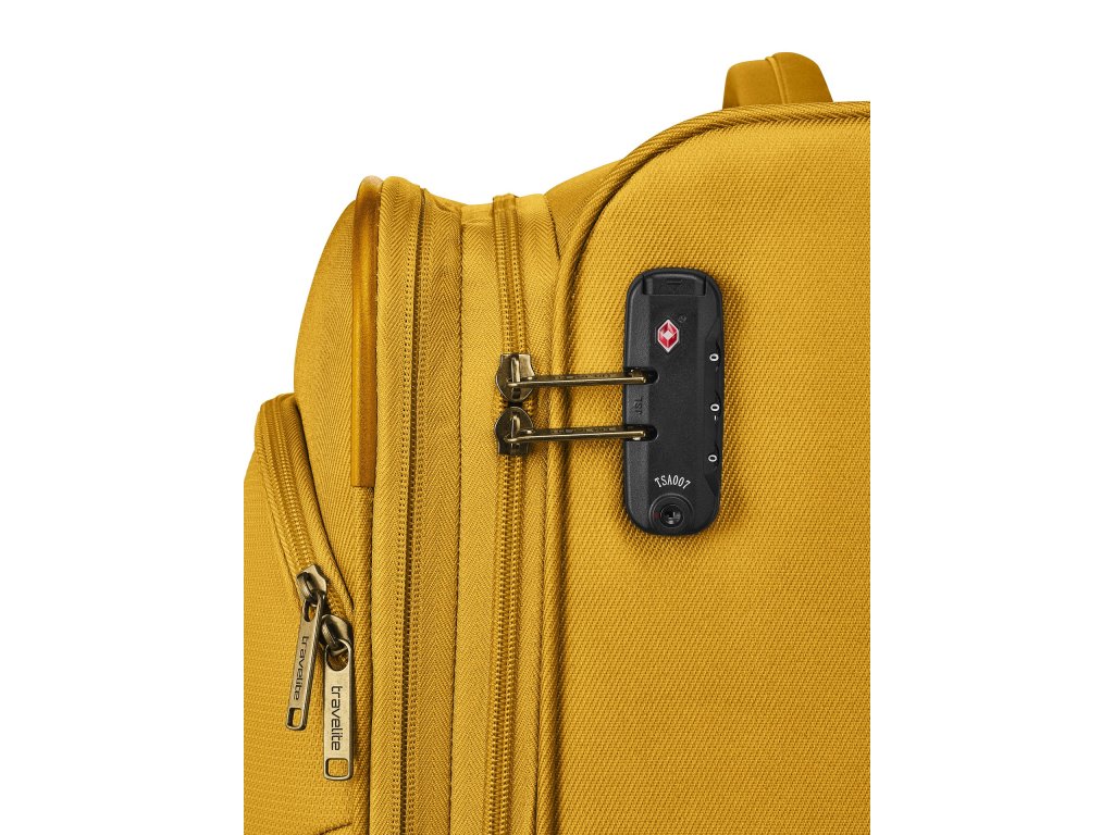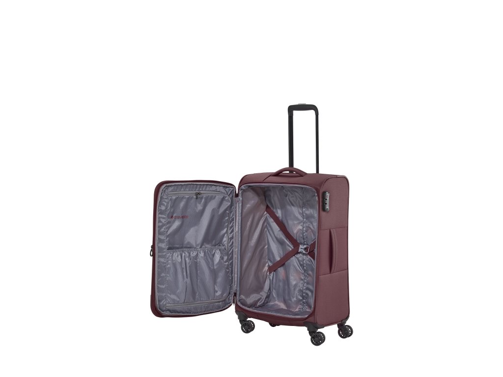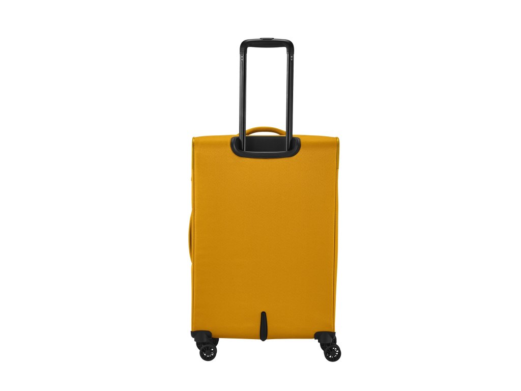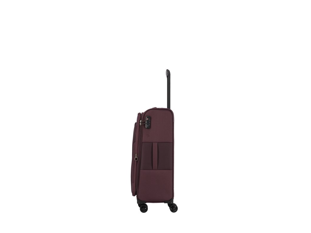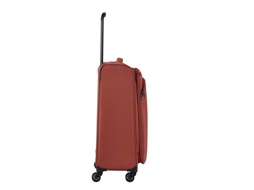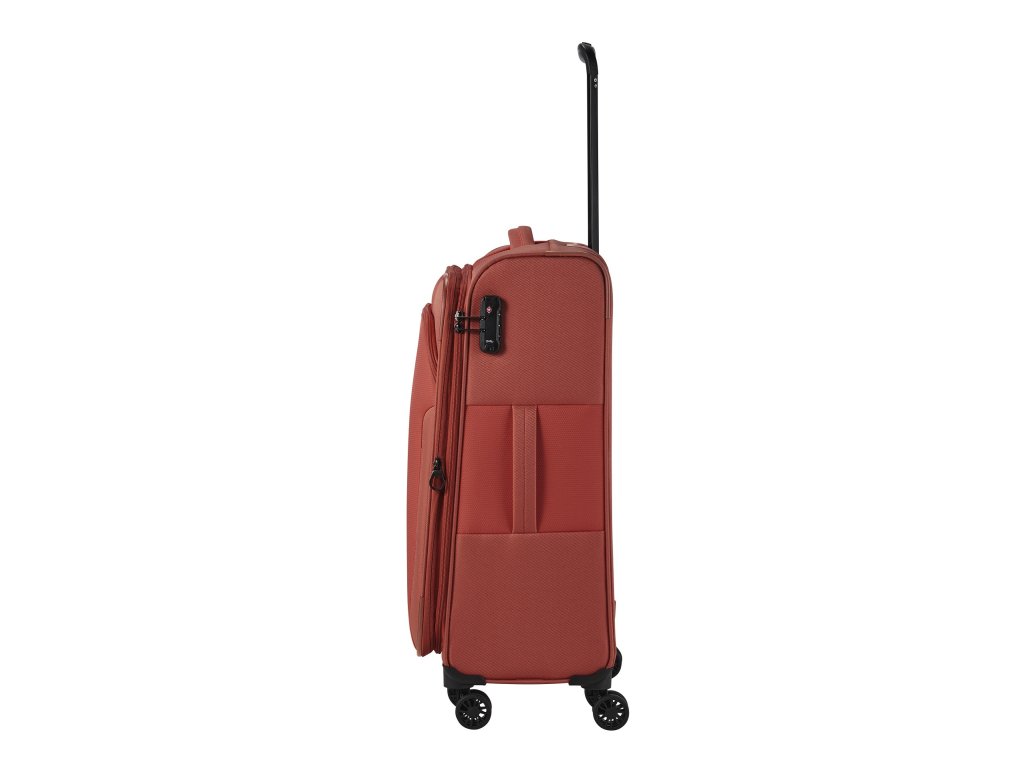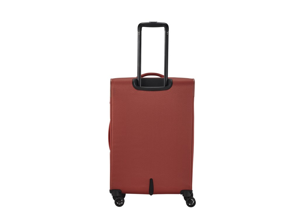 Textilní cestovní kufr na čtyřech kolečkách vybavený integrovaným TSA zámkem, expandérem a přední kapsou na zip.