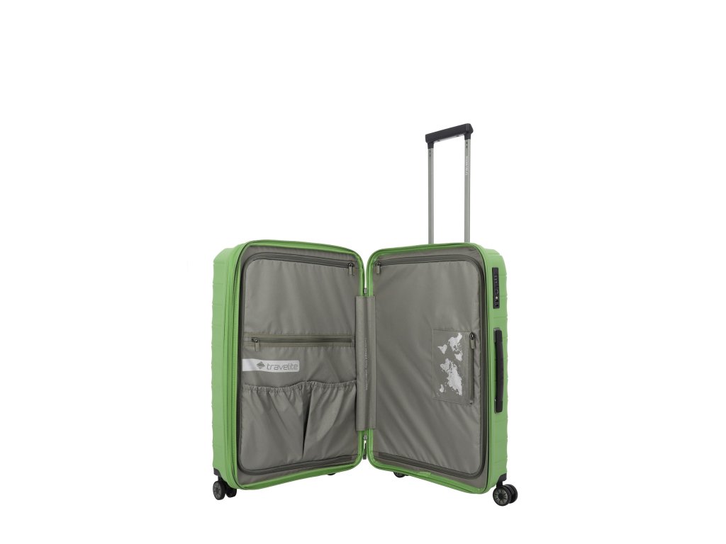 oboustranný systém balení - 2 textilní dělicí příčky - 4 vnitřní kapsy - kompresní popruhy pro optimální fixaci nákladu - odlehčená výsuvná rukojeť s aretací
