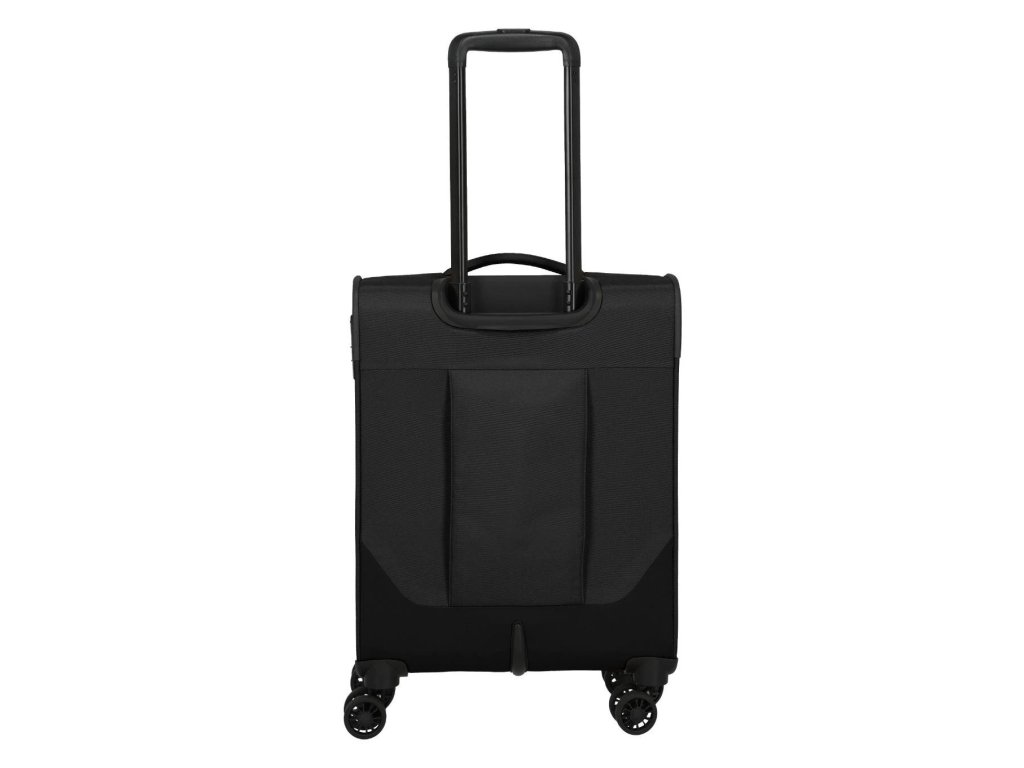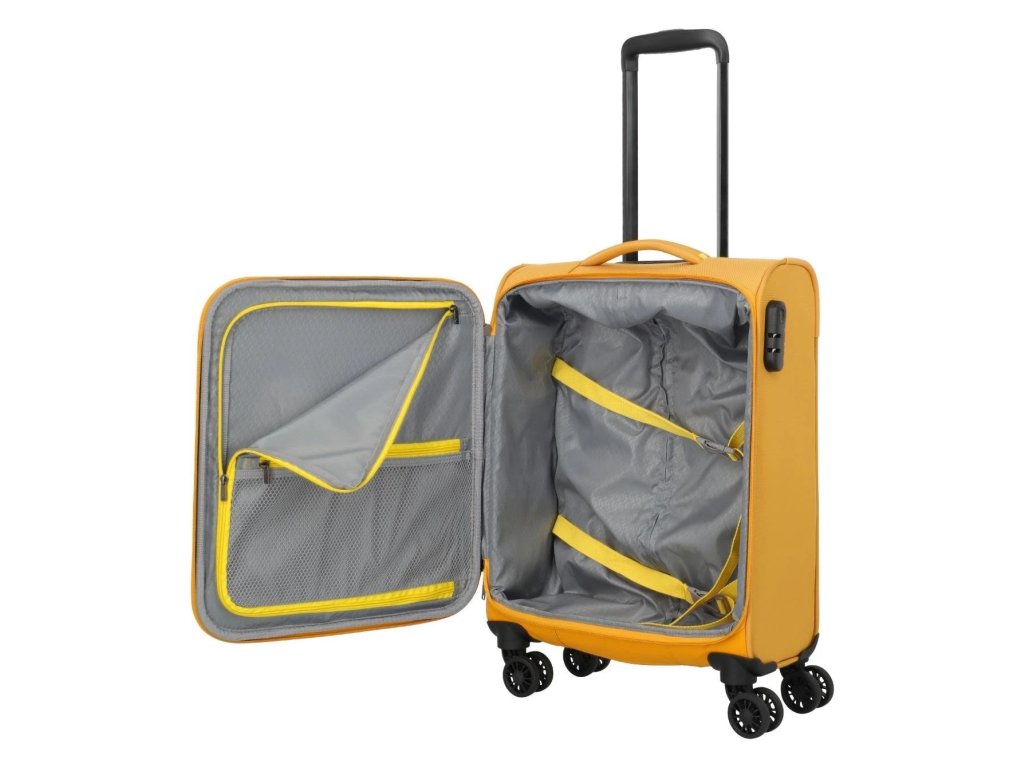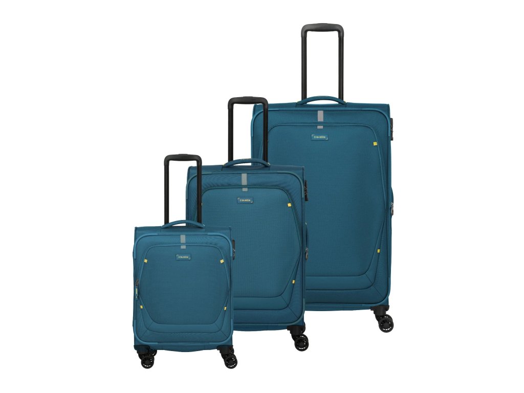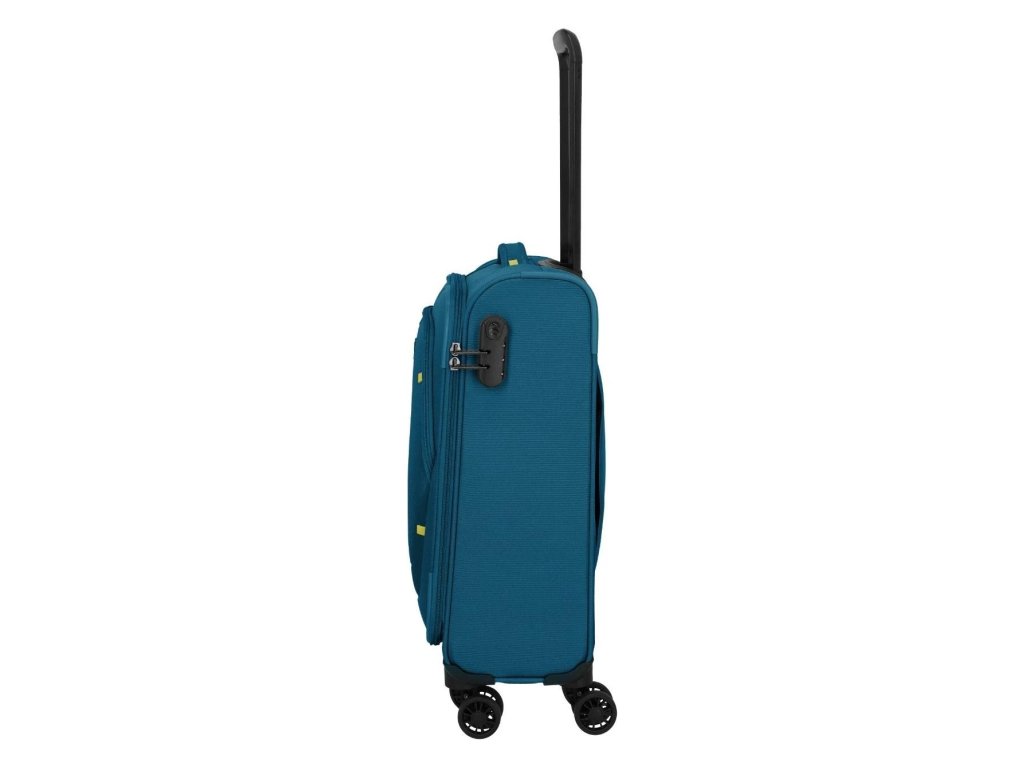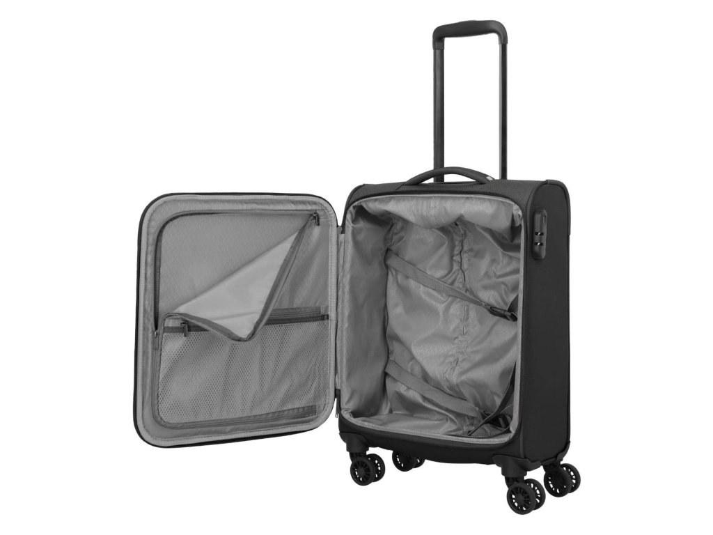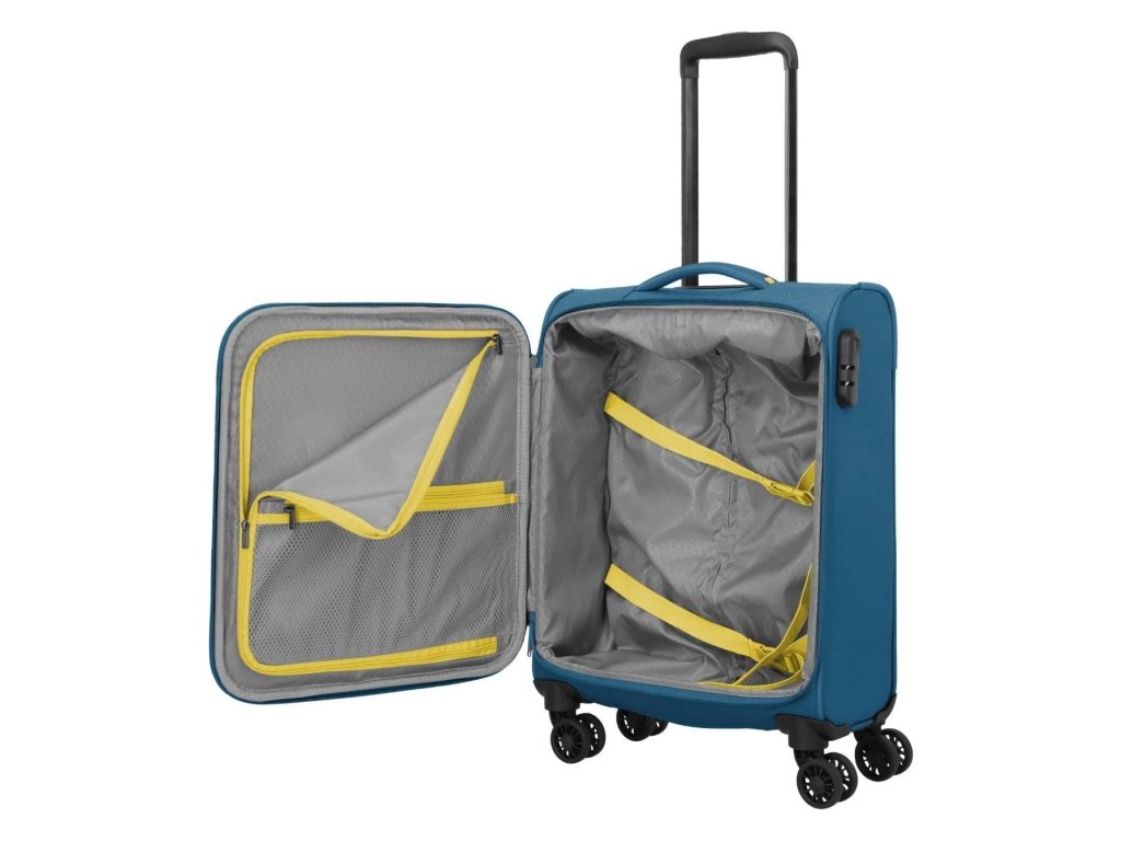 Lehký a přesto prostorný textilní kufr na čtyřech dvoukolečkách pro stabilní jízdu a zámkem.