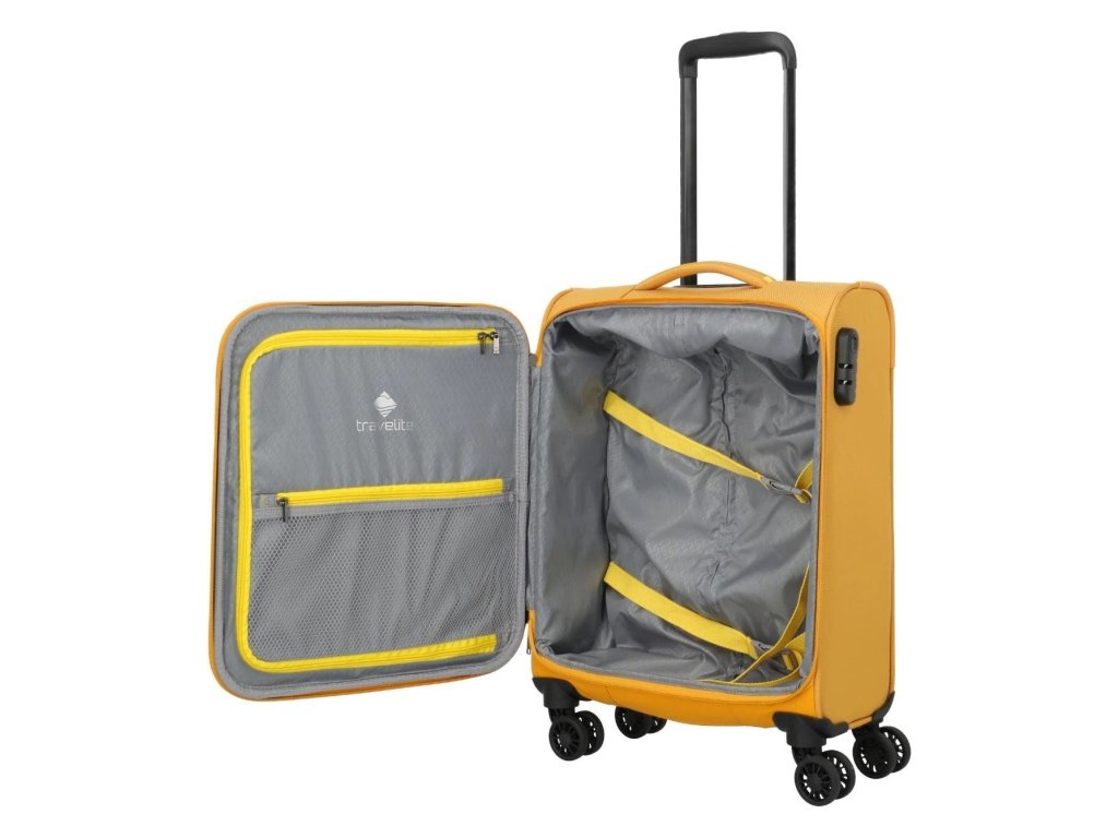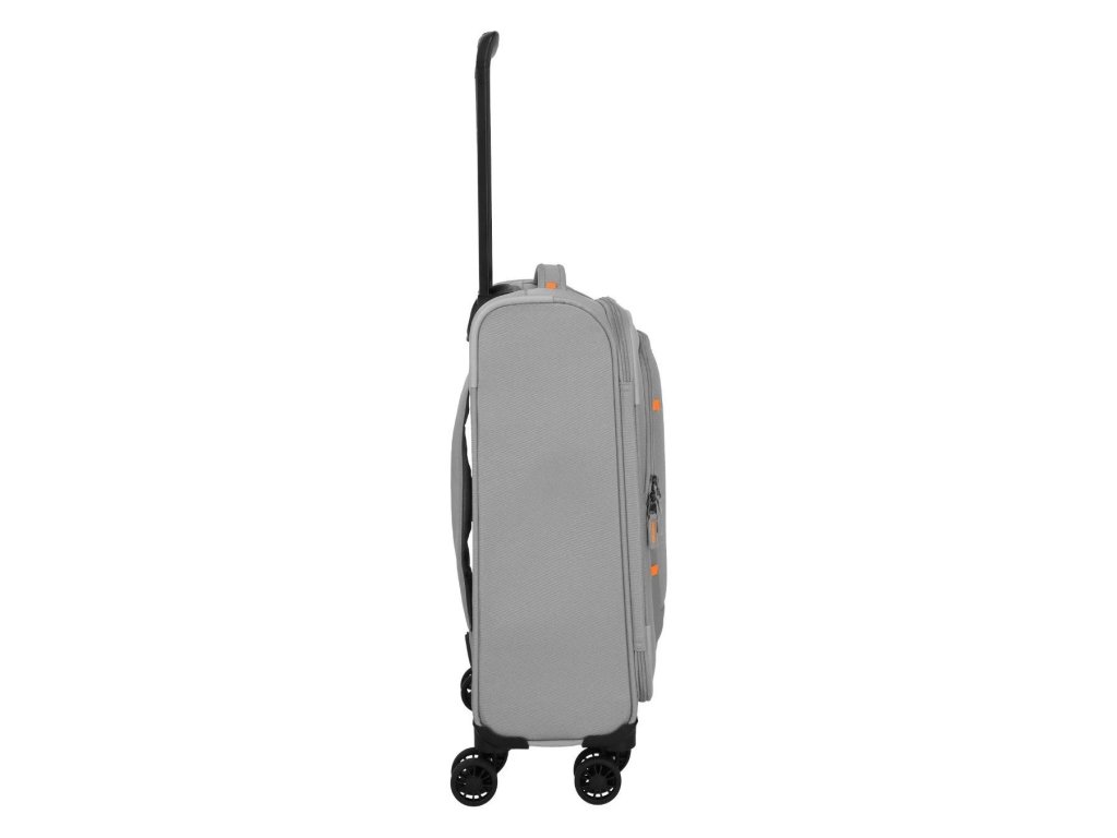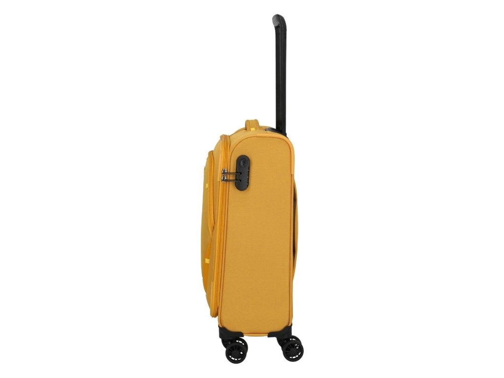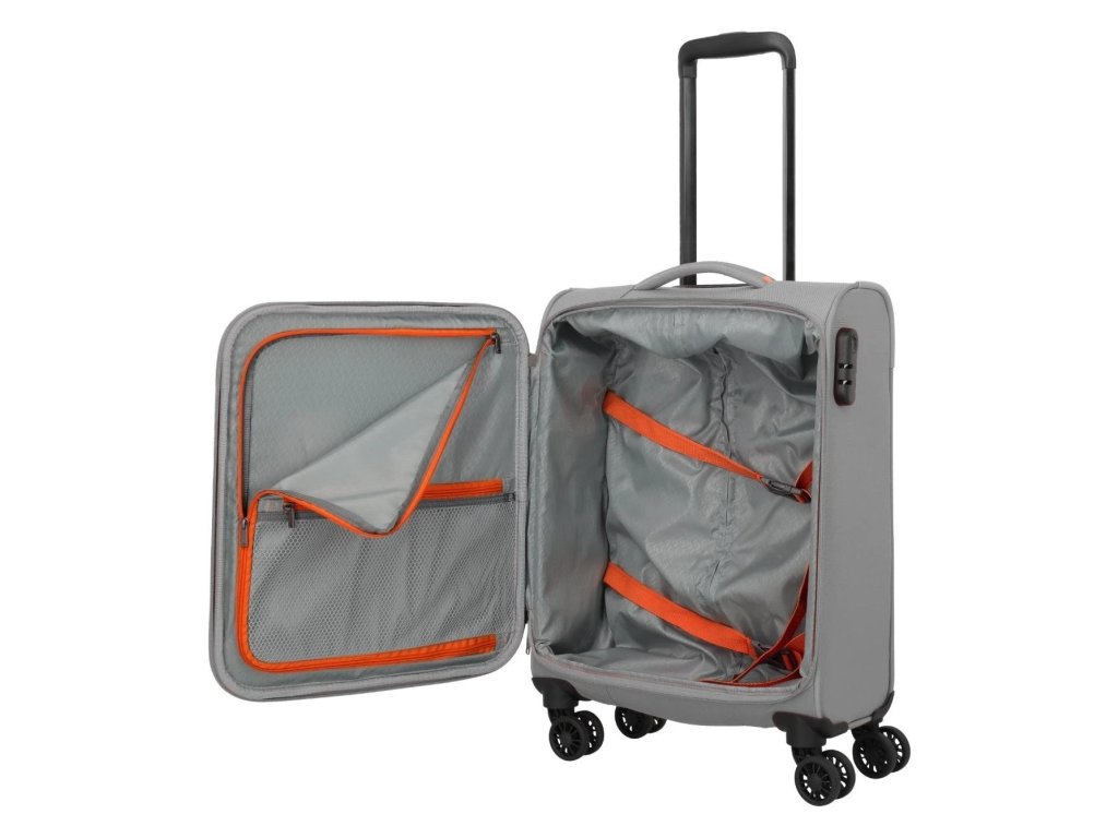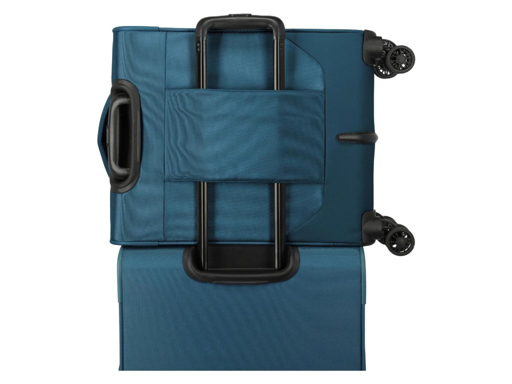 Lehký a přesto prostorný textilní kufr na čtyřech dvoukolečkách pro stabilní jízdu a zámkem.